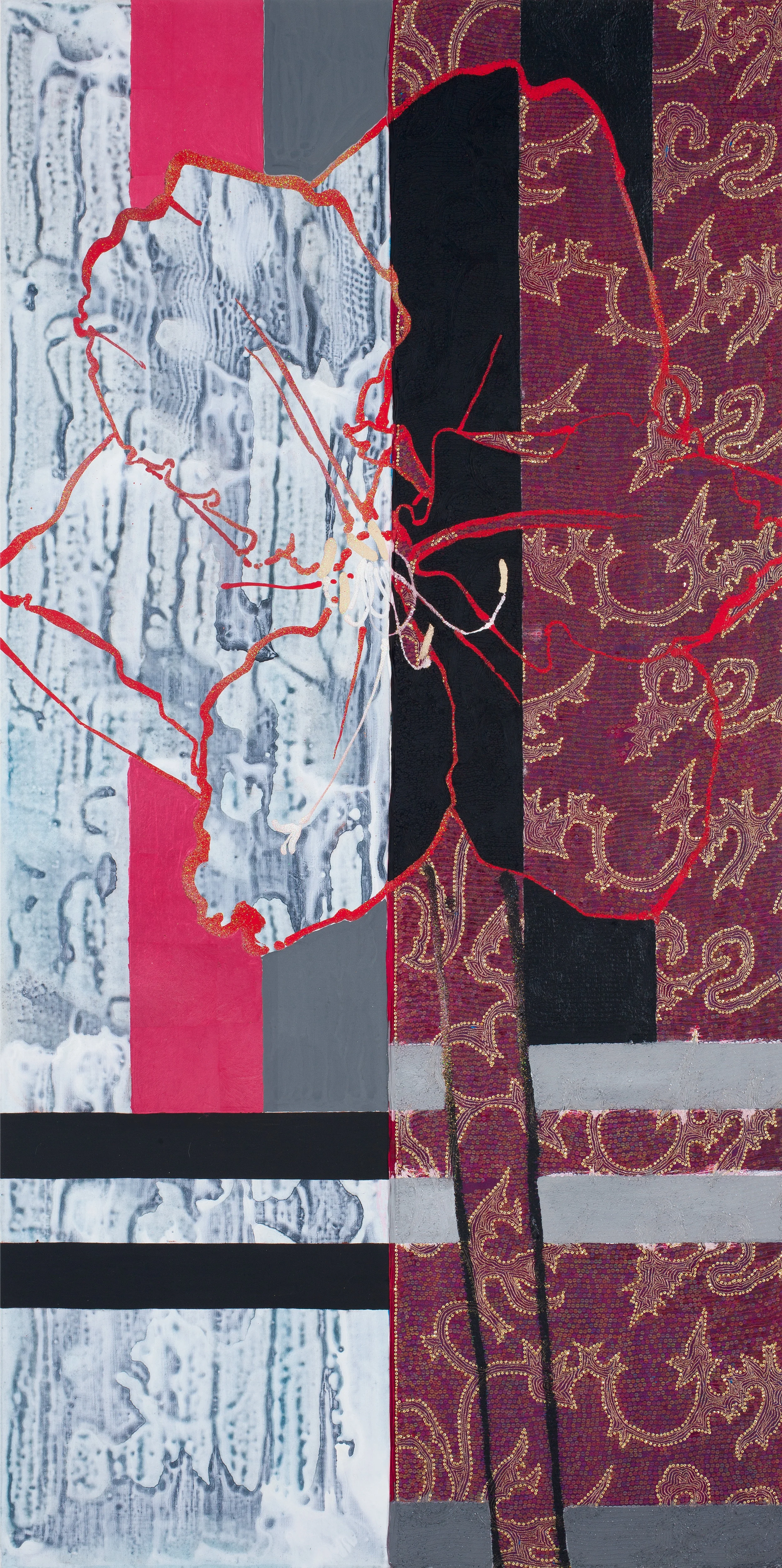 Oil, acrylic, metallic pigment, silk, embroidery, sequins, and glitter on canvas