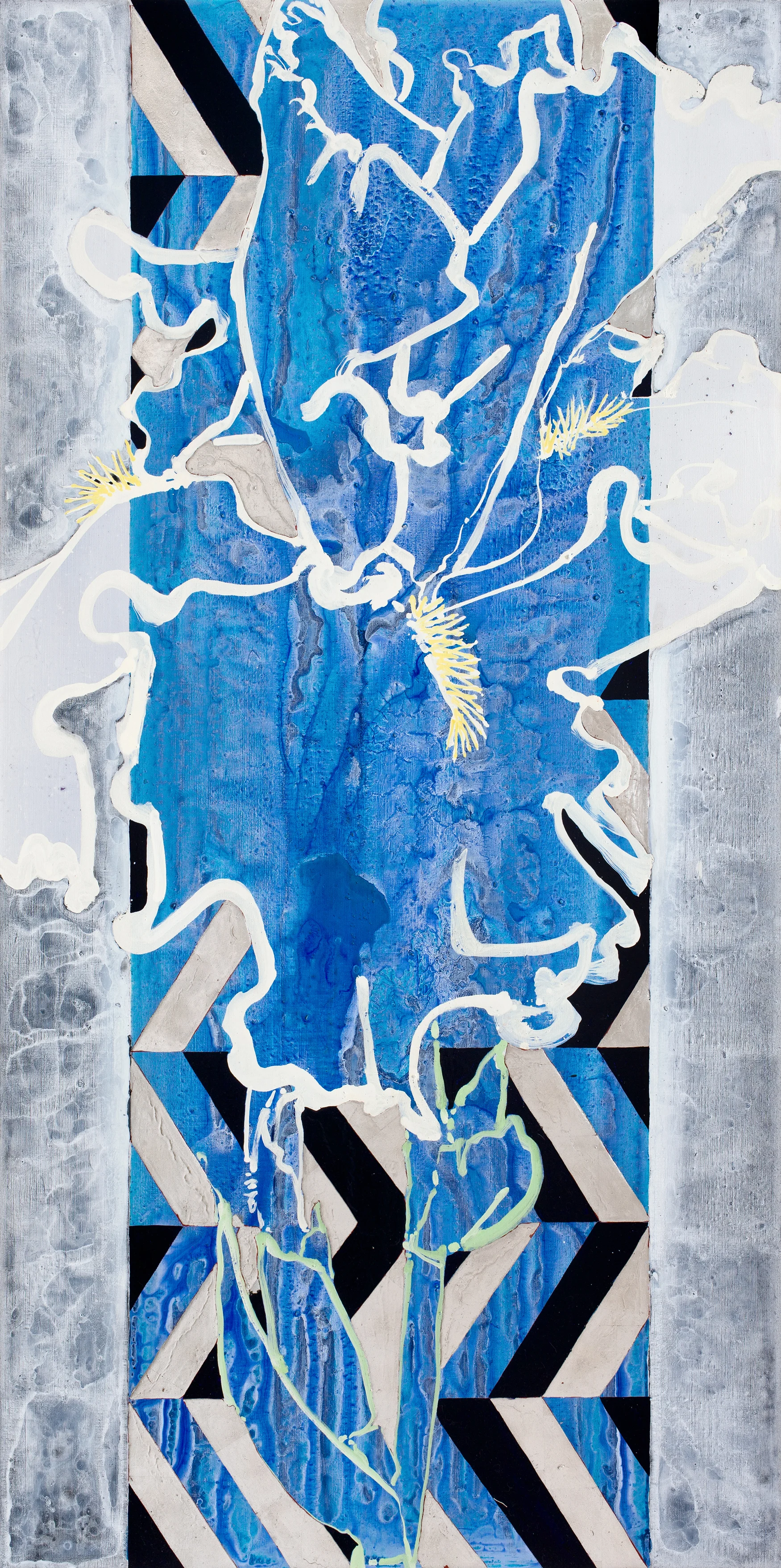 Oil, acrylic, gold leaf, paper, and silk on canvas